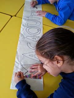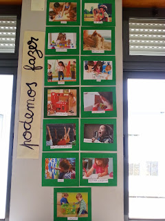 Hoje uma menina trouxe uma fruta "nova", anona. Estivemos a ver no globo terrestre as ilhas onde são produzidas em Portugal, descobrimos os sons da palavra e as letras, escrevemos a palavra. No final do dia comemos a anona.
